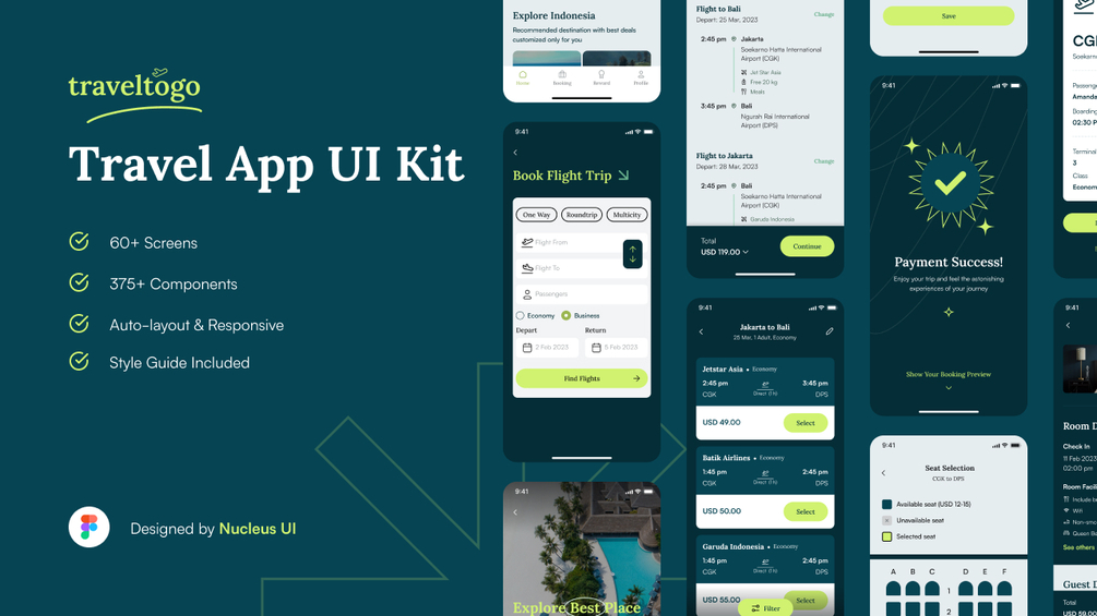 Unpack over thousands of components and variants, 500+ mobile screens (with eight different themes from Event, E-commerce, Finance, NFT, etc. – including Traveltogo – Travel & Itinerary booking mobile app design UI Kit) for only $109.